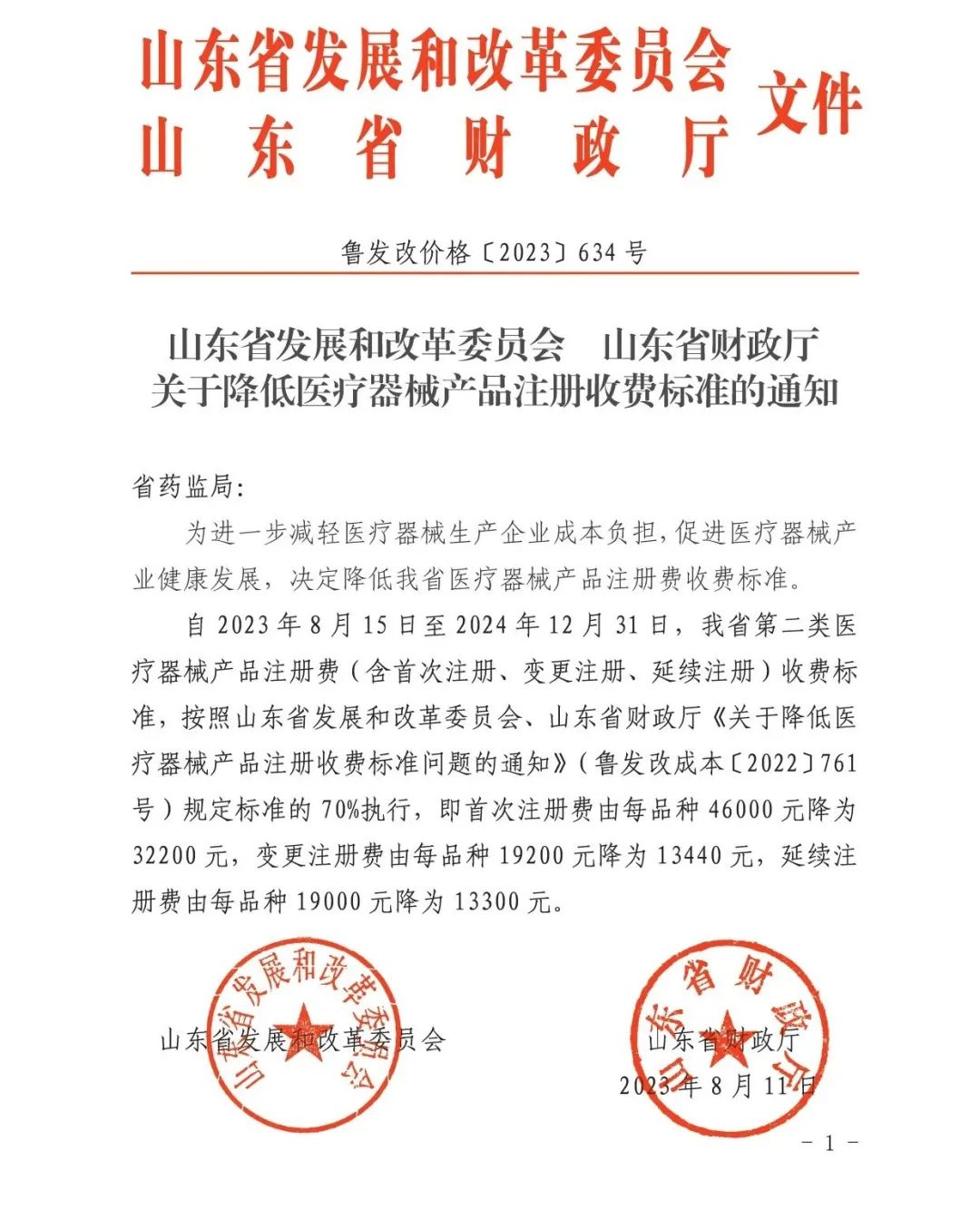 自2023年8月15日至2024年12月31日,我省第二類醫(yī)療器械產(chǎn)品注冊費(fèi)(含首次注冊、變更注冊、延續(xù)注冊)收費(fèi)標(biāo)準(zhǔn),按照山東省發(fā)展和改革委員會、山東省財政廳《關(guān)于降低醫(yī)療器械產(chǎn)品注冊收費(fèi)標(biāo)準(zhǔn)問題的通知》(魯發(fā)改成本〔2022〕761號)規(guī)定標(biāo)準(zhǔn)的70%執(zhí)行,即首次注冊費(fèi)由每品種46000元降為32200元,變更注冊費(fèi)由每品種19200元降為13440元,延續(xù)注冊費(fèi)由每品種19000元降為13300元。