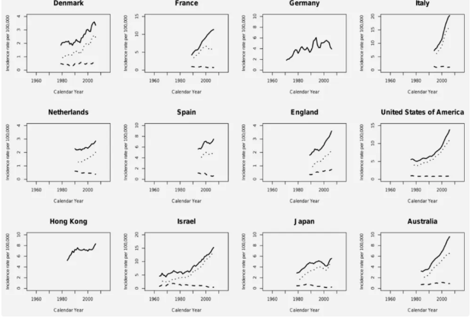 1960 年至 2007 年,在不同國家和地區,男性甲狀腺癌發(fā)病率的總體趨勢呈明顯上升,圖片來(lái)源:參考文獻[4]