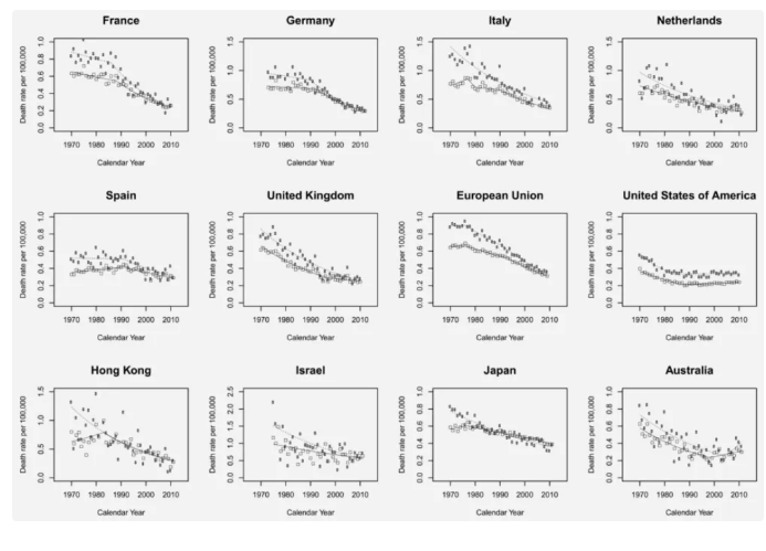 1970 年至 2012 年,在不同國家和地區,女性甲狀腺癌死亡率穩定下降,圖片來(lái)源:參考文獻[4]