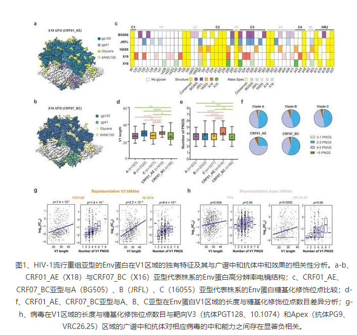 研究團隊首先利用單分子冷凍電鏡技術(shù)與生物大分子質(zhì)譜全面揭示了CRF01_AE和CRF07_BC代表型株系的Env蛋白結構與糖基化修飾(圖1a-c)。隨后從上述研究中獲得的線(xiàn)索出發(fā),對當前數據庫中六千余條不同亞型的Env蛋白的V1區域進(jìn)行了跨亞型對比和分析。結果顯示,相比于其他亞型,CRF01_AE亞型的V1區域長(cháng)度顯著(zhù)增長(cháng)(圖1d),且糖基化修飾位點(diǎn)數目顯著(zhù)增多(圖1e-f)。進(jìn)一步對中和實(shí)驗數據和V1區域特征的關(guān)聯(lián)分析則顯示CRF01_AE亞型在V1區域的上述特征會(huì )明顯削弱兩類(lèi)廣譜中和抗體(分別靶向Env蛋白的apex與V3區域)對CRF01_AE亞型的中和效果(圖1g-h)。上述研究結果提示,應盡量避免在CRF01_AE亞型的流行區域開(kāi)展靶向Apex或V3區域的免疫聚焦型疫苗或廣譜中和抗體的臨床試驗。