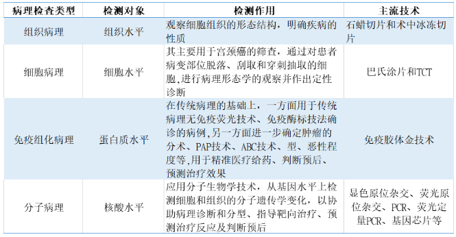 病理學(xué)根據(jù)發(fā)展階段的不同主要分為傳統(tǒng)病理技術(shù)(組織病理、細(xì)胞病理)、免疫組化病理和分子病理。傳統(tǒng)的組織病理建立在組織、細(xì)胞的水平上,可以通過(guò)病理醫(yī)師的顯微鏡診斷來(lái)判斷疾病的性質(zhì)(炎癥性病變還是腫瘤型病變、良性腫瘤還是惡性腫瘤等);免疫組化病理建立在蛋白質(zhì)水平上,可以進(jìn)一步判斷腫瘤的組織來(lái)源、原發(fā)部位、病理分型、殘留邊緣癌細(xì)胞等,除了診斷作用以外還具有指導(dǎo)預(yù)后的作用;分子病理建立在核酸分子水平上,可以確定腫瘤的基因突變類型,用于后續(xù)靶向藥物的指導(dǎo)以實(shí)現(xiàn)精準(zhǔn)醫(yī)療。