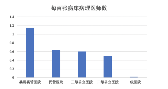 如上圖所示,其中委屬委管醫(yī)院每百?gòu)埐〈膊±磲t(yī)師數(shù)僅為1.15,三級(jí)公立醫(yī)院、二級(jí)公立醫(yī)院和民營(yíng)醫(yī)院分別為0.60、0.50及0.64。根據(jù)最新發(fā)布的《2019年全國(guó)病理質(zhì)量報(bào)告》顯示,在不同級(jí)別的醫(yī)院中,全國(guó)平均每百?gòu)埐〈膊±磲t(yī)師數(shù)量為0.55,病理醫(yī)師數(shù)量奇缺的狀況沒有改善,各省、自治區(qū)、直轄市均未達(dá)到2009年《病理科建設(shè)與管理指南(試行)》(以下簡(jiǎn)稱《指南》)的最低要求(每百?gòu)埓?-2名病理醫(yī)師)。