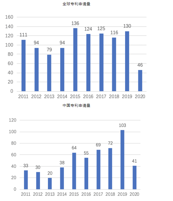 上圖所示為以“病理診斷”和“細(xì)胞病理”進(jìn)行全球檢索得到的近10年的專利申請(qǐng)情況。從圖中可以看出,病理診斷領(lǐng)域近10年約有1055件專利申請(qǐng)(由于發(fā)明專利有18個(gè)月公開的滯后期,實(shí)用新型從申請(qǐng)到公開也需一段時(shí)間,因此2019年和2020年數(shù)據(jù)有所偏差),其中發(fā)明專利604件、實(shí)用新型專利179件。從圖2中可以看出,全中國(guó)病理診斷領(lǐng)域近10年約有525件專利申請(qǐng)(由于發(fā)明專利有18個(gè)月公開的滯后期,實(shí)用新型從申請(qǐng)到公開也需一段時(shí)間,因此2019年和2020年數(shù)據(jù)有所偏差)。
